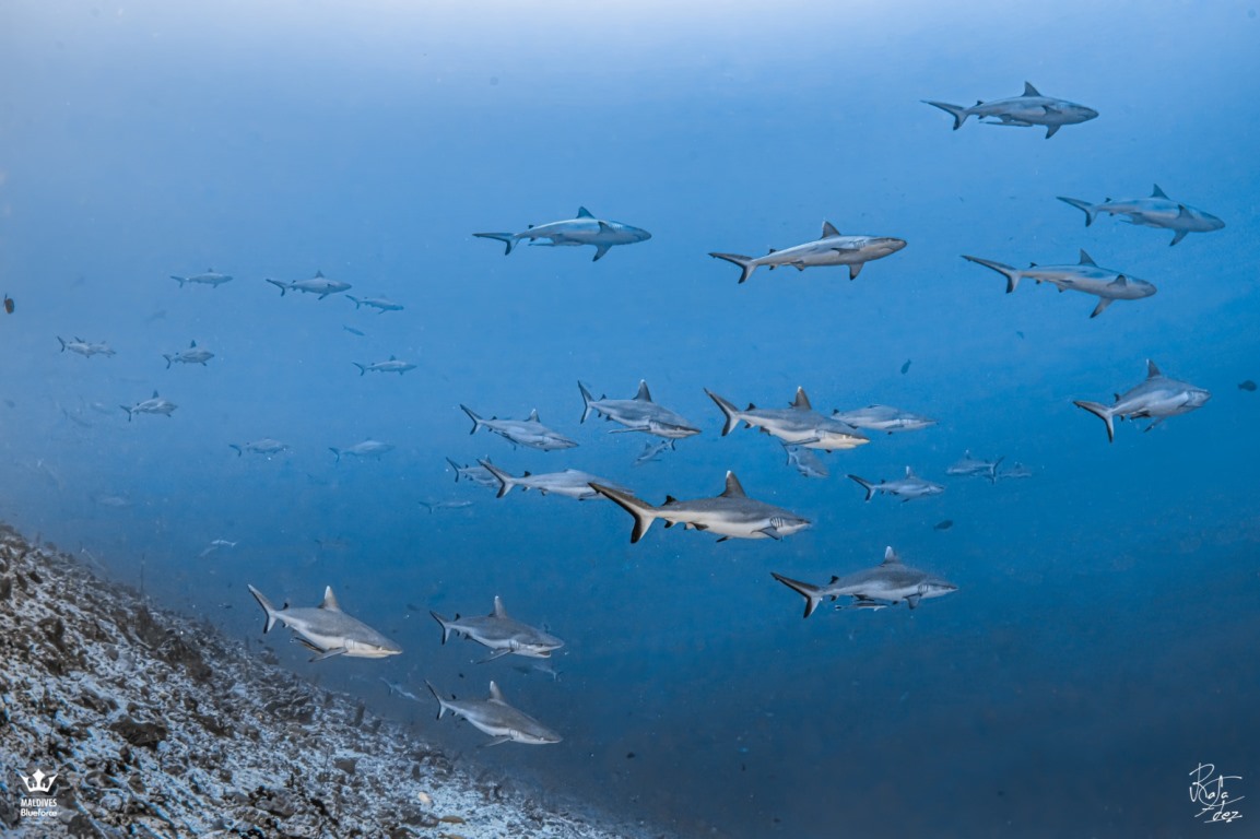 The Central Atolls route is available 10 months of the year starting and ending in Male. The aim of this trip is to find pelagic, grey sharks, white tip sharks, blacktip sharks, the occasional hammerhead shark, and dolphins. Schools of colorful fishes, morays, tuna, grouper, and turtles just to name a few of the other inhabitants. They do two night dives, one with Mantas and one with dozens of nurse sharks.