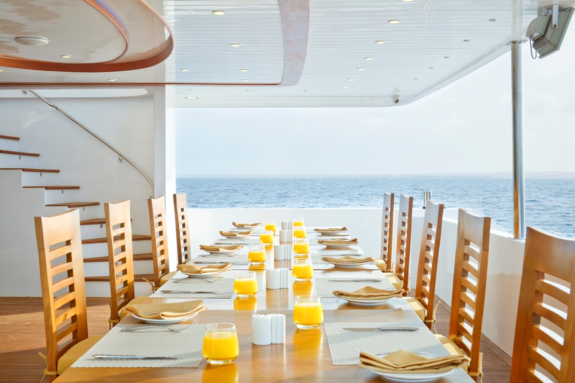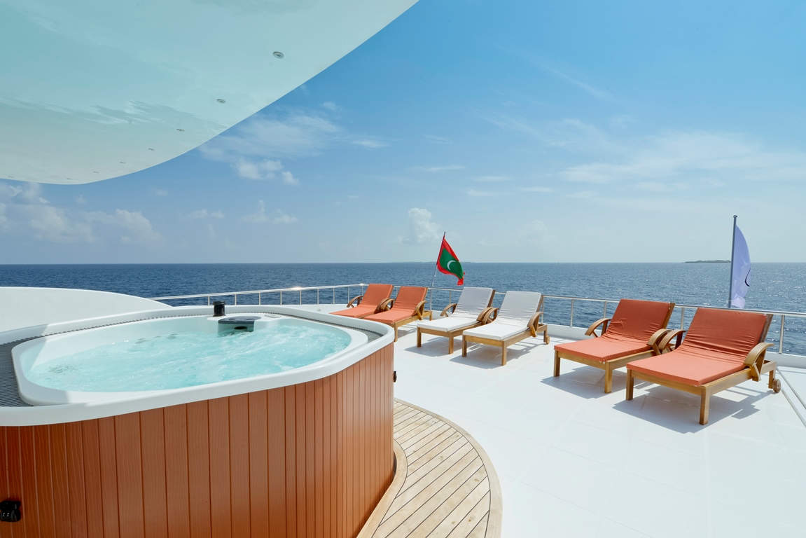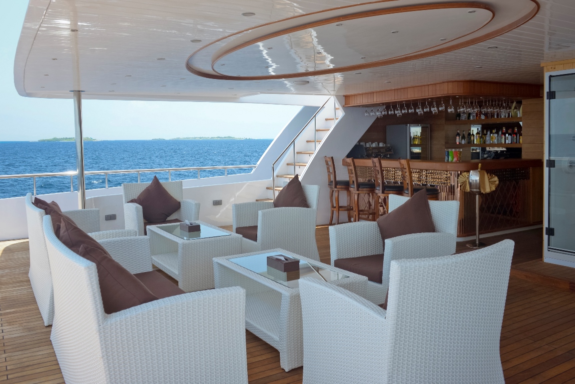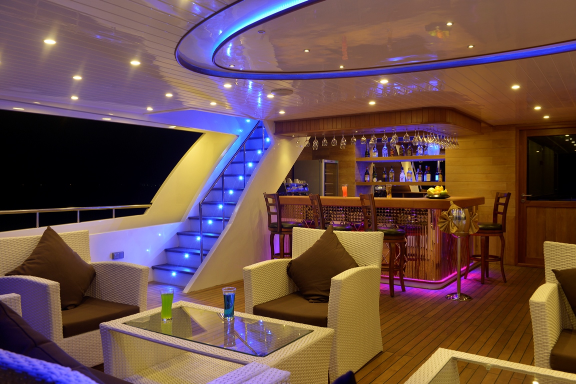 The 138 foot Maldives Blue Force One has been awarded “The Best Boat Built in the Maldives” twice by the liveaboard association of the Maldives. She boasts 12 cabins for 12 passengers in deluxe cabins, master cabins, junior suite, and master suites. There is plenty of room to spread out with two outdoor jacuzzies, one on the main deck and one on the sun deck. There are two solariums with sunbeds on the main deck and sun deck. She has an outdoor bar on the upper deck. The indoor living room has a bar and large TV. You’ll feel like you are in a private cocktail lounge while you relax in comfortable couches and chairs. The boat has a clean, sleek modern feel to all its furnishings.