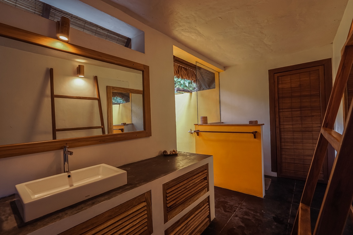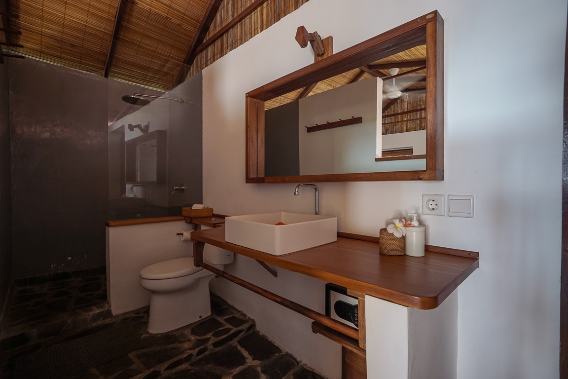 The 100-square-meter villa offers guests space and privacy. The villas are surrounded by a garden with plenty of flowers and palm trees. Every villa has an inside lounge area as well as a big wardrobe space and an open-air bathroom. For rainy days, there is an indoor shower. The villas are all equipped with a minibar a water dispenser and complimentary coffee and tea. A Bluetooth speaker allows you to listen to your favorite music while enjoying a drink on your private balcony.