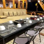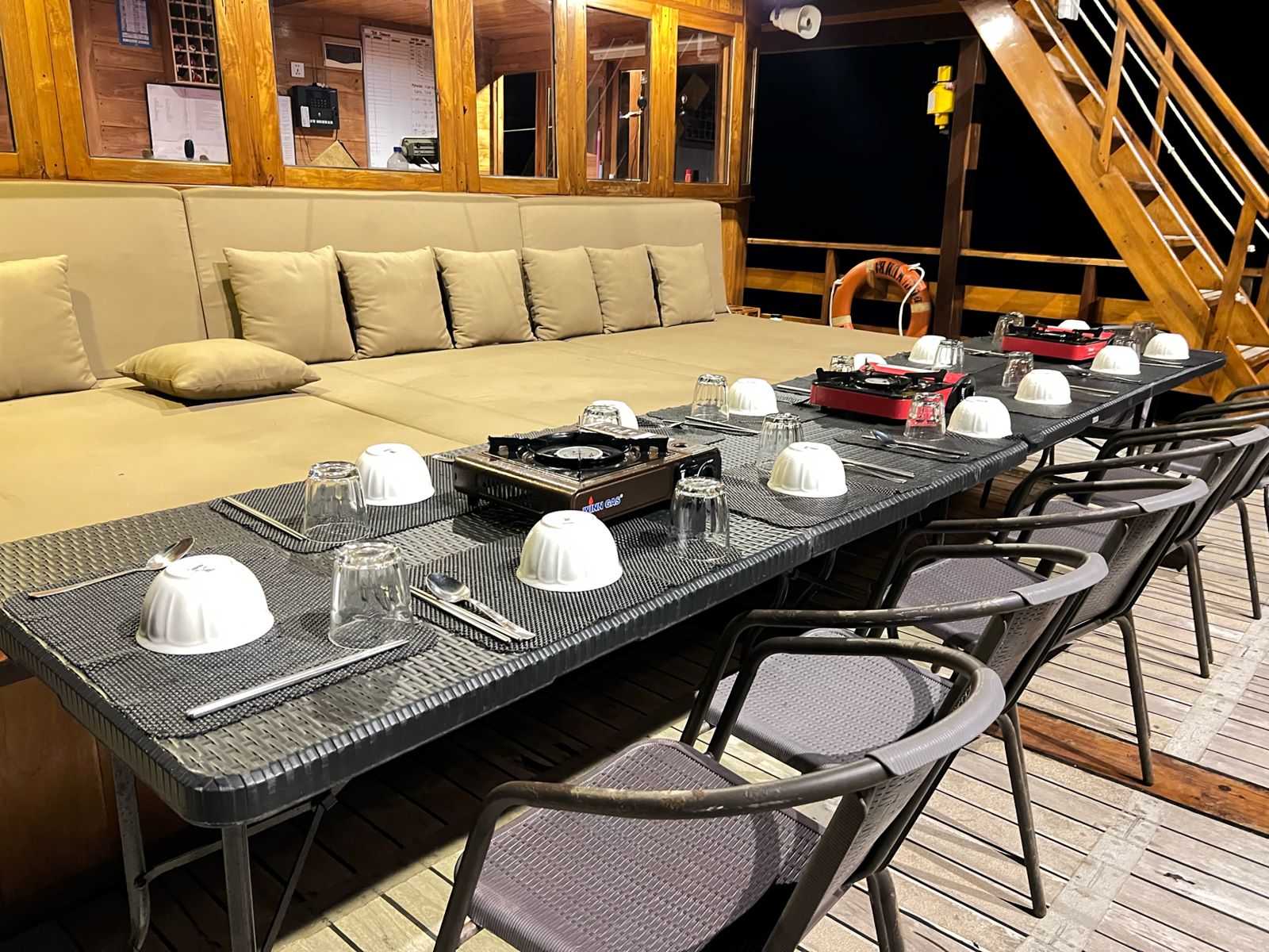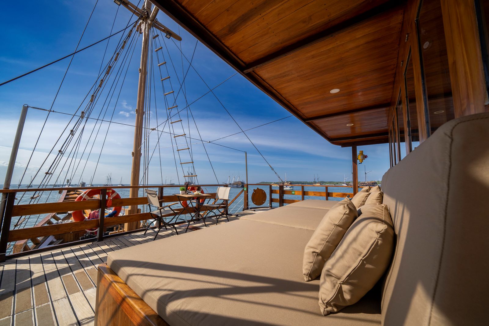 She features a large air-conditioned salon, dining area, and a sun deck with lounge and deck chairs. The Komodo Aggressor has a TV with a media player and a sound system in the main salon.