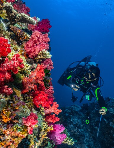 Explore the Rainbow Reef with our highly qualified PADI divemasters. Our resort is located only 10 minutes from the best dive sites of the Rainbow Reef, such as the Great White Wall. We are the only luxury dive resort with its own dive operation located on the reef.