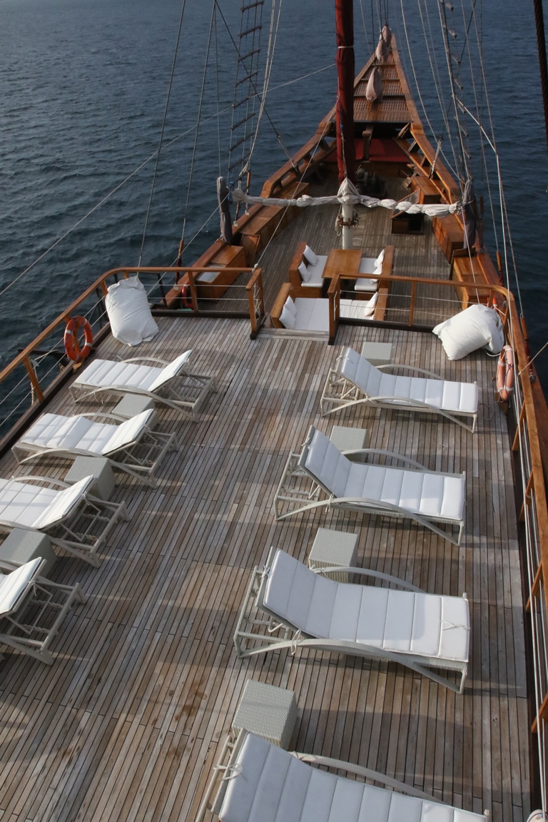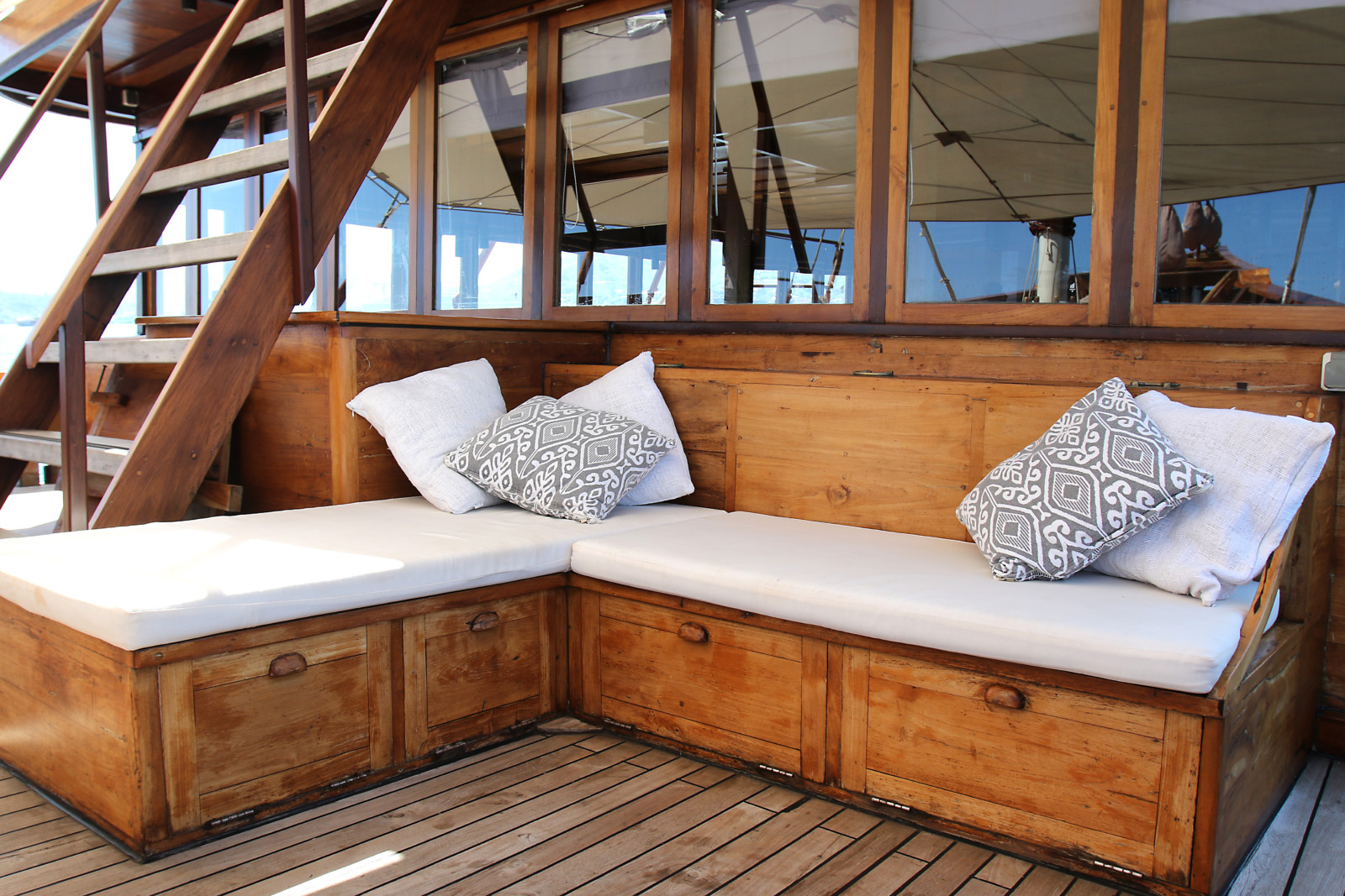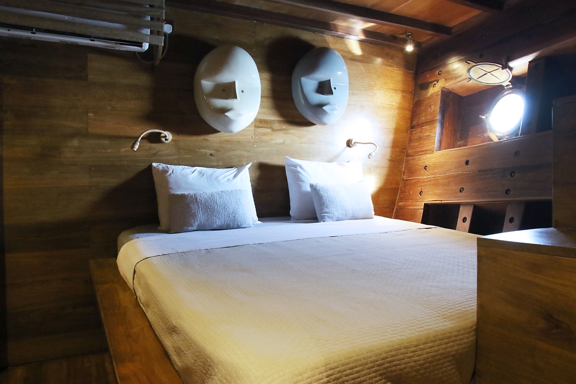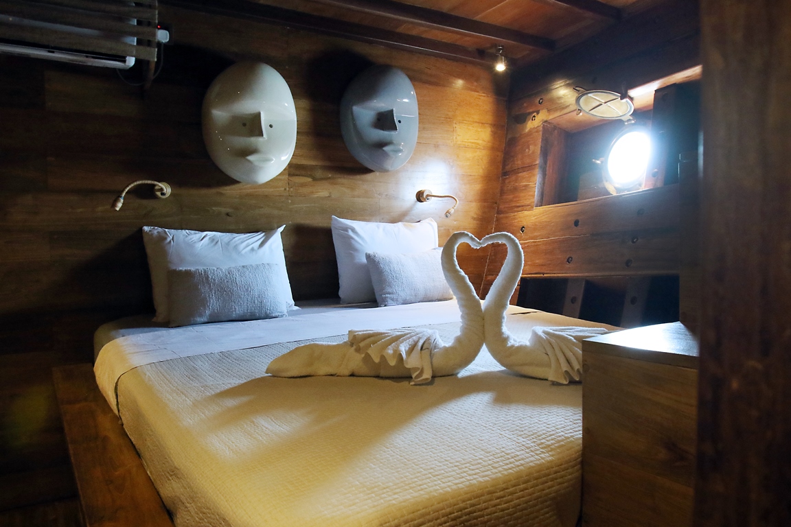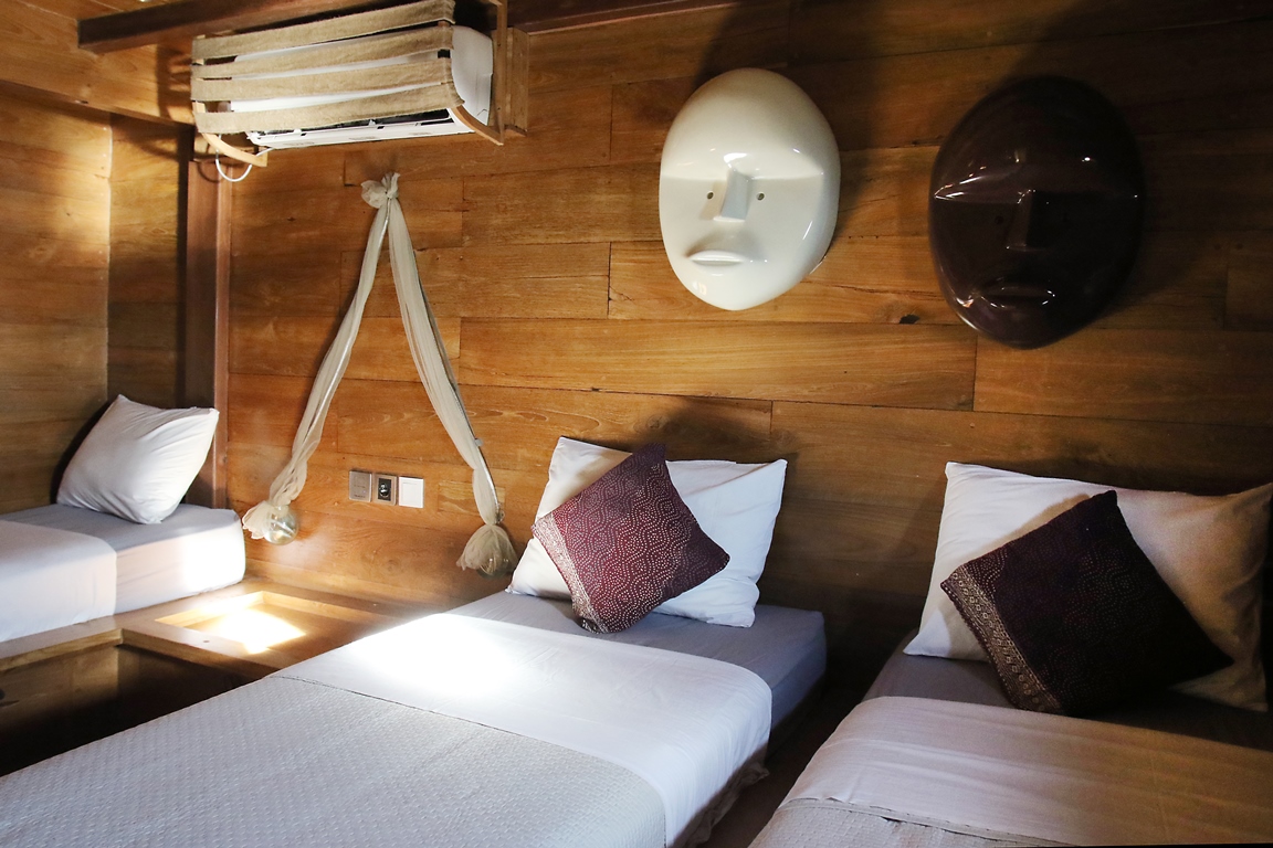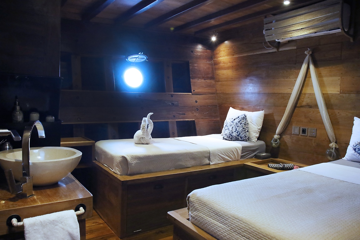 All cabins are made from recycled teak wood. She carries up to 14 passengers with a crew of 17 in 2 double cabins, 2 twin cabins, and 2 triple cabins. All cabins have en-suite bathrooms, air conditioning, fire detector and toiletries for your convenience.