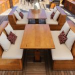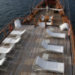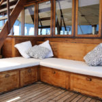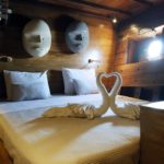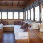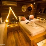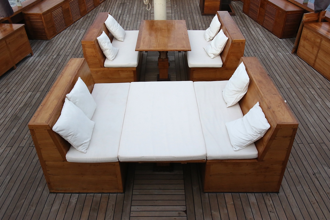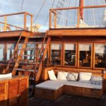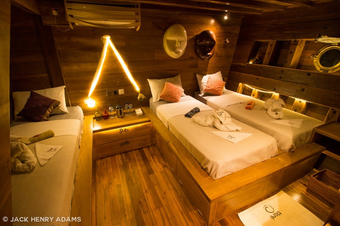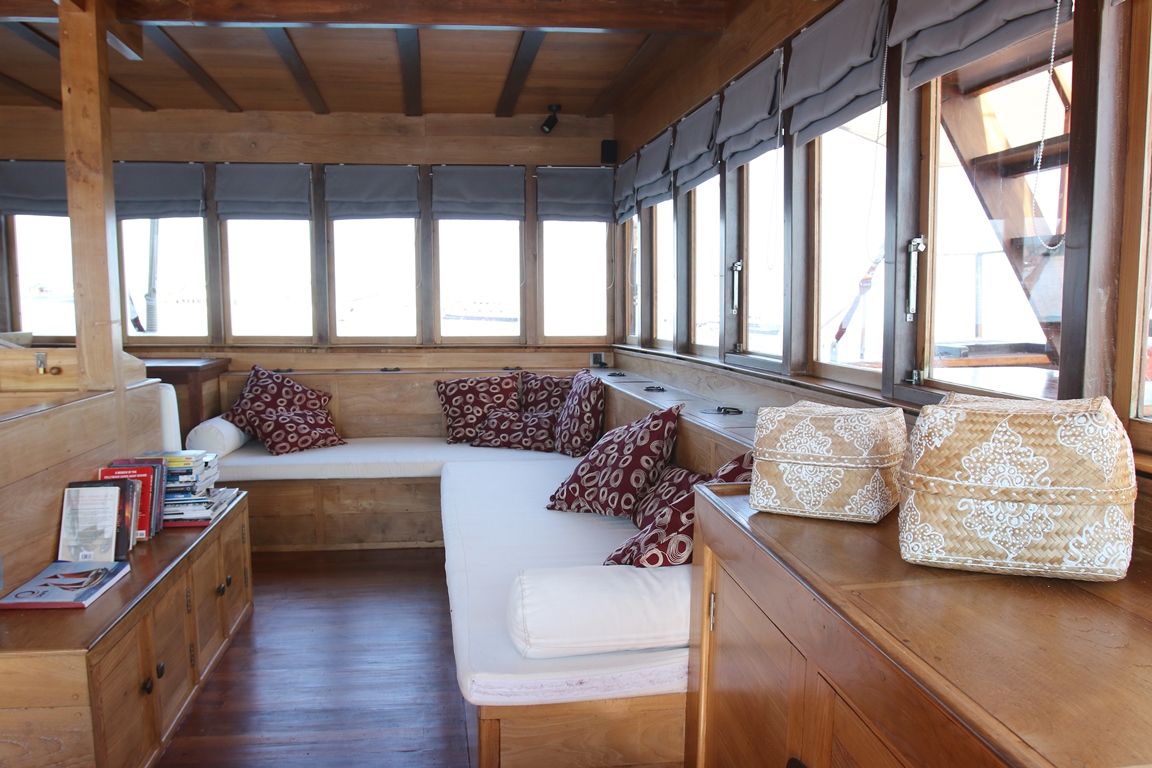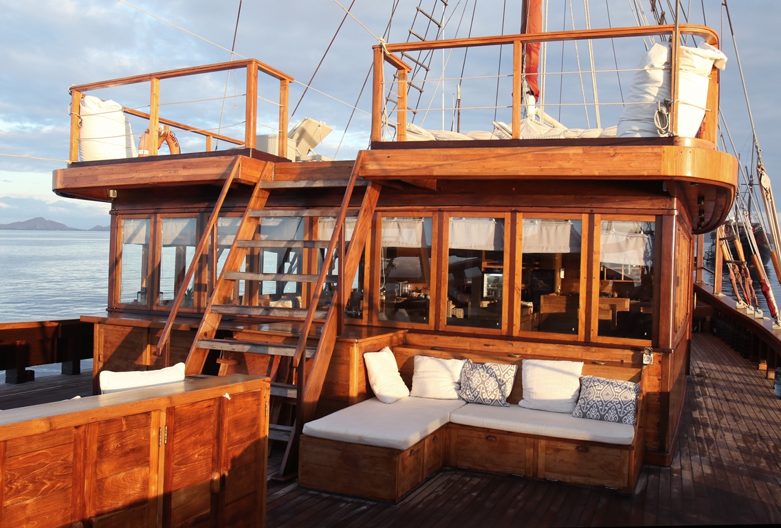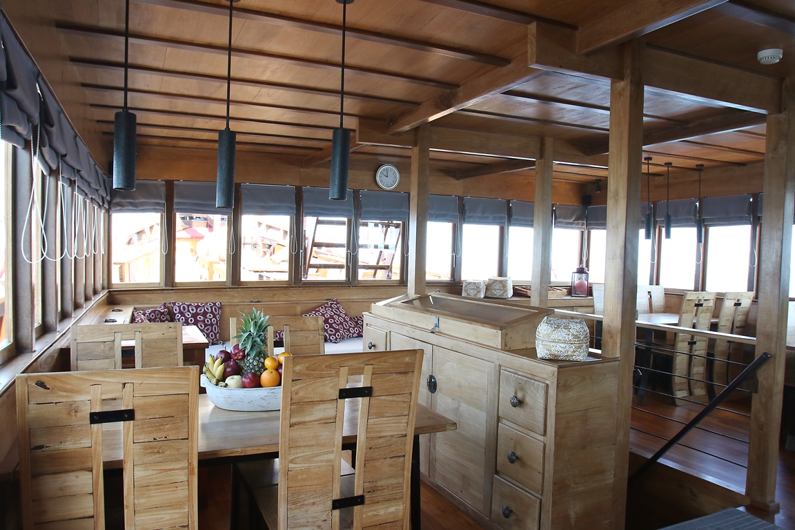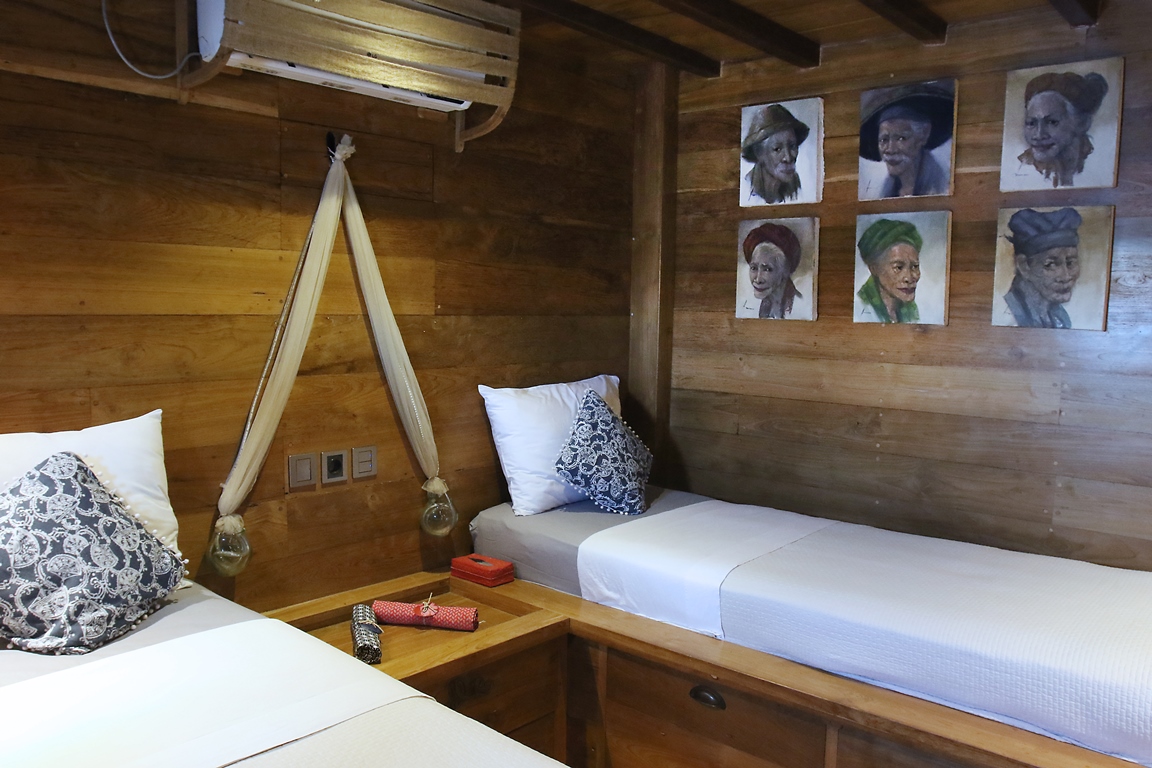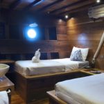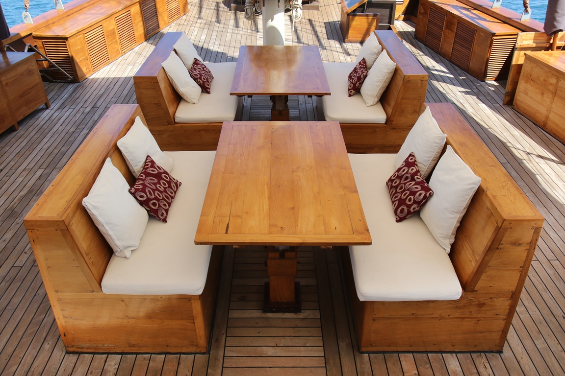 All cabins are made from recycled teak wood. She carries up to 14 passengers with a crew of 17 in 2 double cabins, 2 twin cabins, and 2 triple cabins. All cabins have en-suite bathrooms, air conditioning, fire detector and toiletries for your convenience.