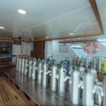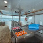 The Tiburon Explorer's large dive deck includes a bathroom, a large camera table with a charging station, individual storage areas, rinse bins for cameras, and another for gear. Diving operations are conducted from two large pangas (tenders), easily boarded from the dive deck.
