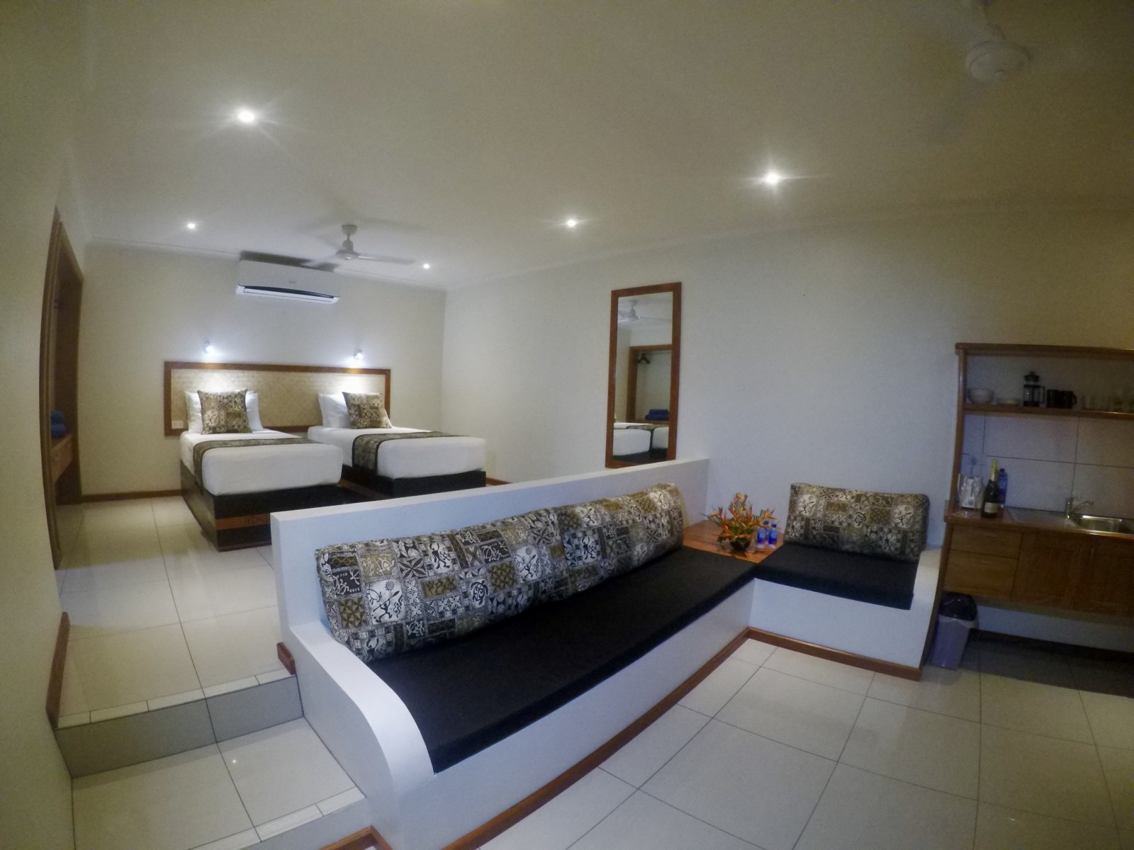 The Ocean View rooms are for dive groups or more budget conscious families. They have 1 queen bed and 2 singles in one room.