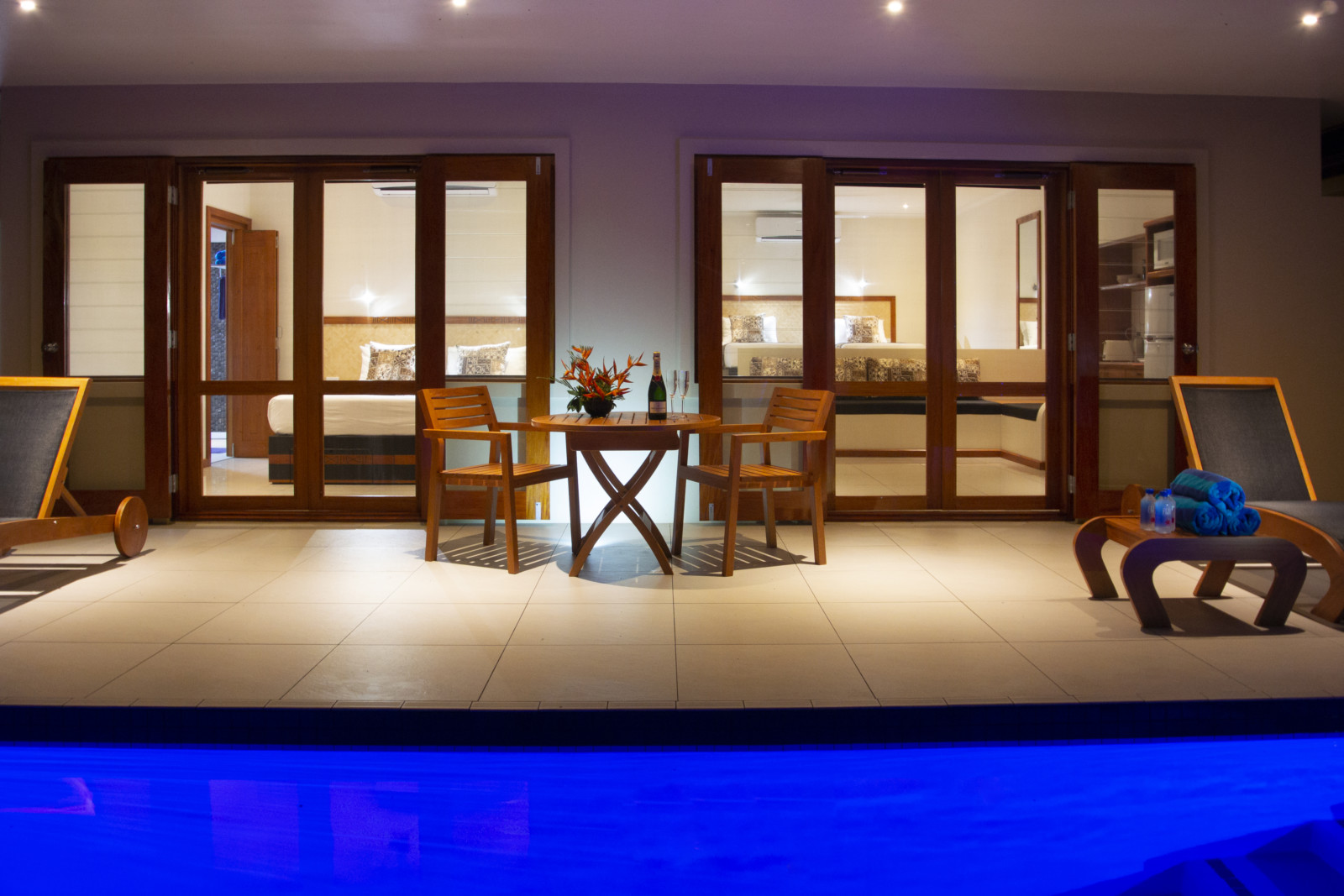 Luxury Oceanfront Villas are tucked away at the front edge of the property overlooking the ocean and nearby island. They have a spacious outdoor covered living area, private plunge pool and terrace with two bedrooms. Perfect for families